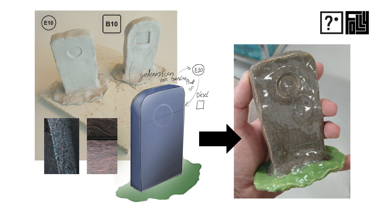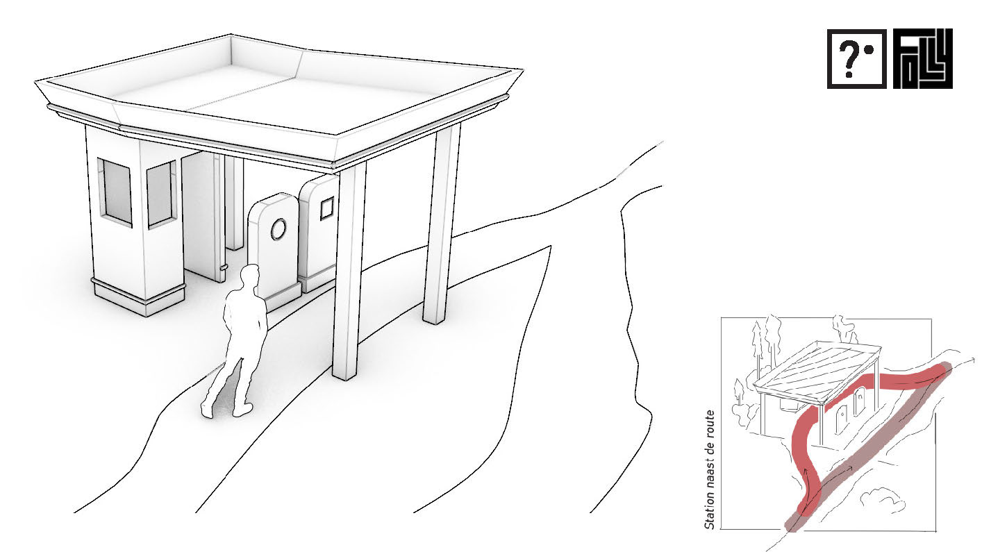 grafstenen beschikken over een cirkel (benzine) en een vierkant (diesel), om zo te fungeren als laatste rustplaats voor de fossiele brandstof. Verder vertoont de Follyzich als ‘liminal space’: Door het tankstation uit zijn hedendaagse context te trekken wordt het een surrealistische plek. Een doorstroomplek met een herkenbare vormgeving die door de afwezigheid van de originele functie een intrigerend karakter aanneemt. Idealiter staat Station daarom naastgelegen aan de wandelroute om zo een korte omweg langs het