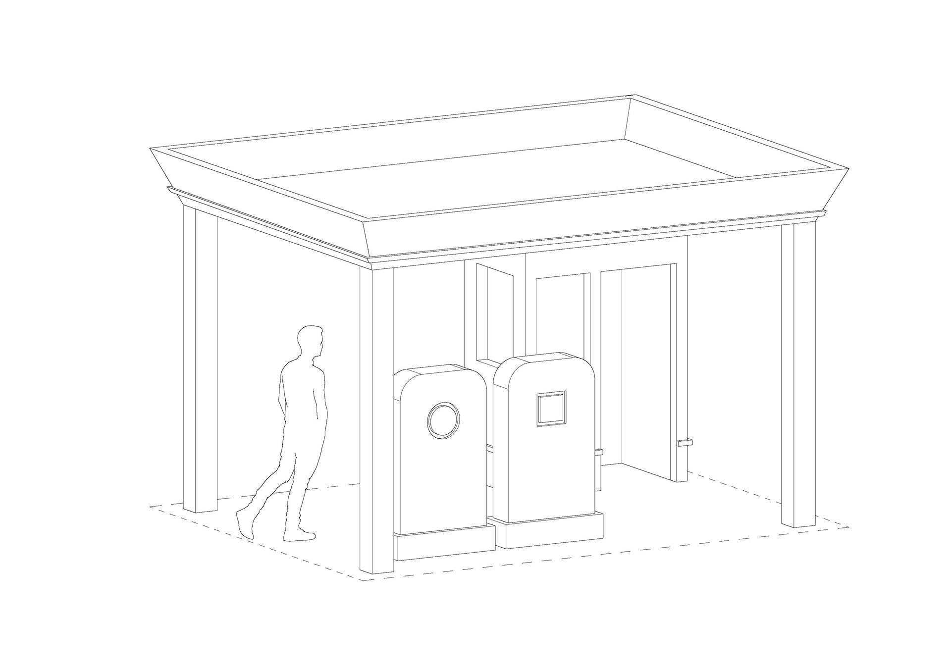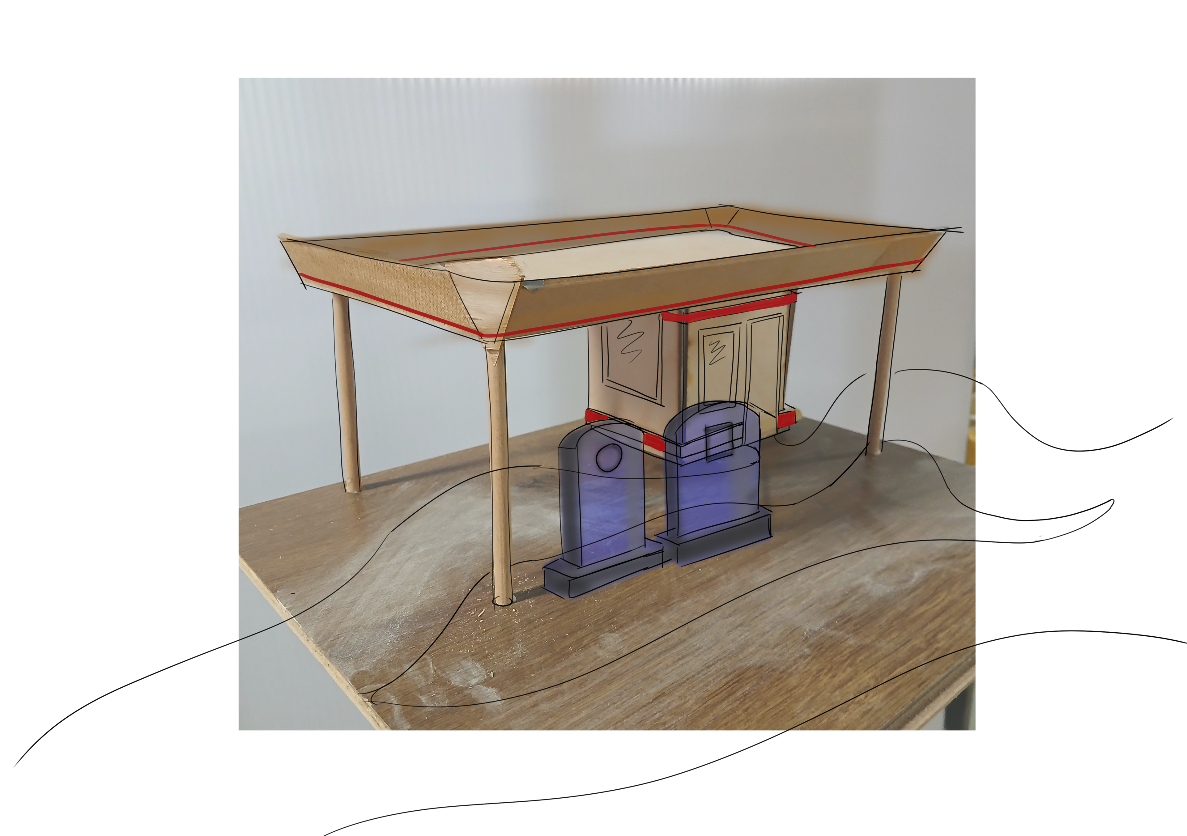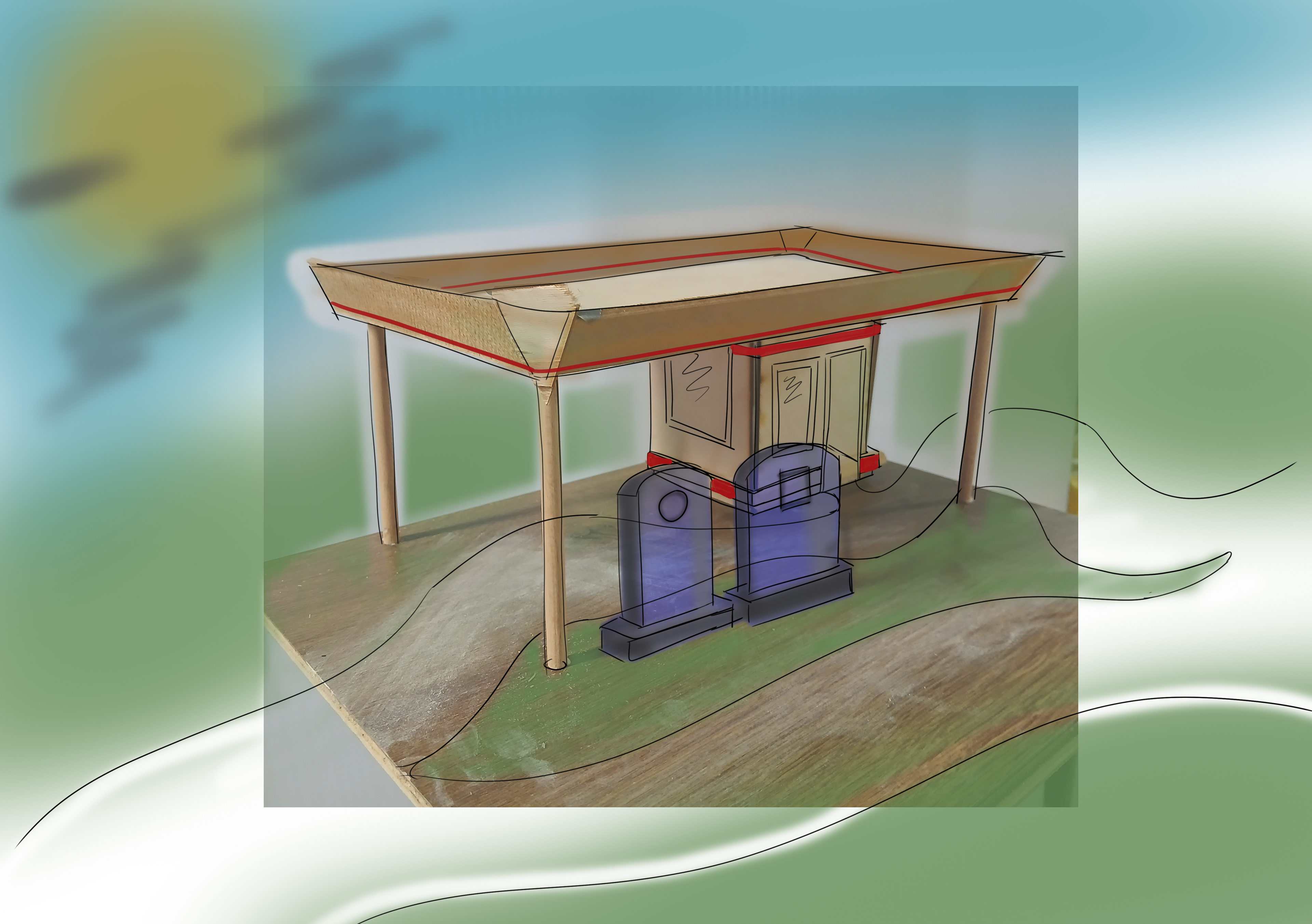 Om een keer hierbij stil te staan hebben Sem Mous en Nathan Douenburg het eens omgedraaid: wat als we alleen nog maar de benewagen tot onze beschikking hebben. Wat is een er dan nog over van de architectuur van het tankstation. Hoe verhouden we ons tot een plek waar beweging, doorreizen, en versnelling de boodschap is. Door het tankstation te abstraheren en te verschallen creeëren we een ruimtelijke ervaring waarbij de versteende pompen aanzetten tot vertragen.